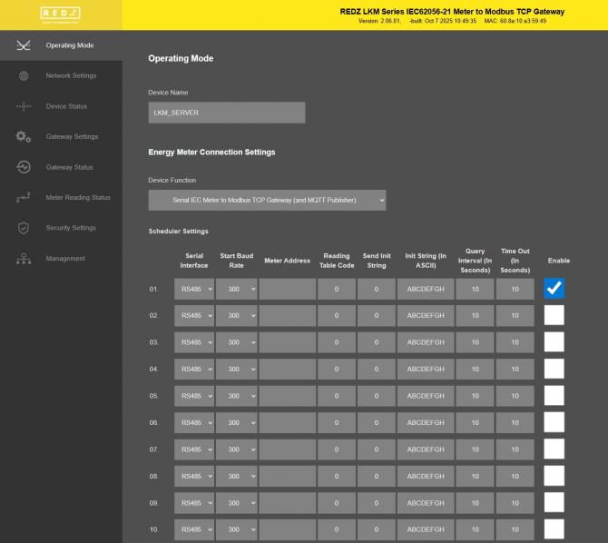 When "Device Function" is set to "Serial IEC Meter to Modbus TCP Gateway with MQTT Publisher", Scheduler Settings part will show a list to enter details regarding meter reading