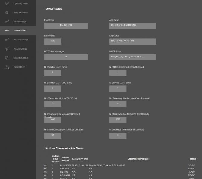 - Current Modbus frame details is possible to find in "Device Status" page